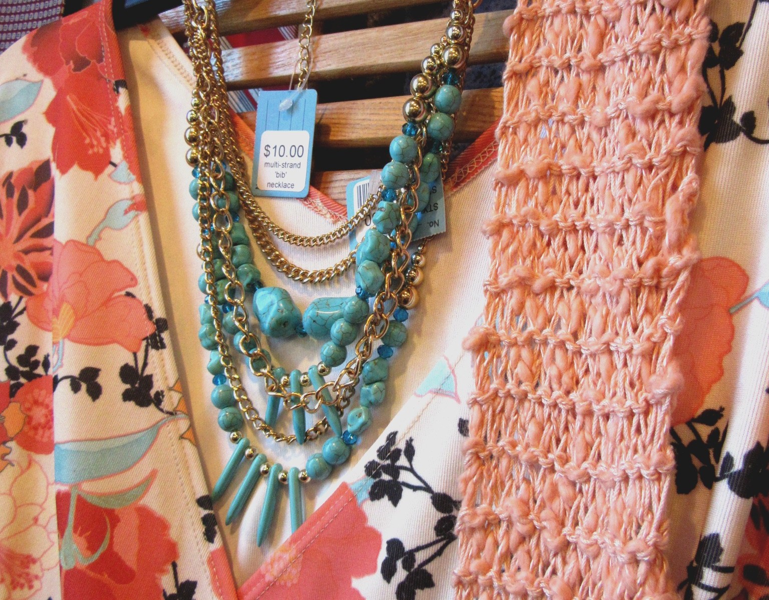 Get this look at Wear: Inspirational look costs around $12,500 (Chanel purse, leather pants, etc). Wear look costs $72 + tax. How about that green 'tooth' necklace? We have one, in purple: On sale now, $5.