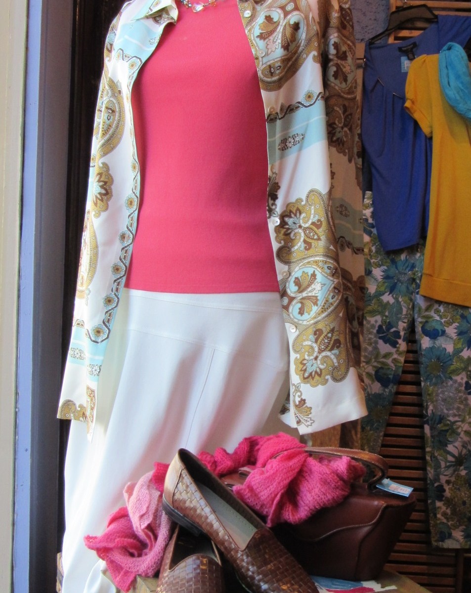 Subtle pattern combination--this turquoise tweed skirt paired with this Asian inspired floral top. The turquoise in the shirt matches well with the skirt, and the Asian inspired hard-leather purse (Italian, vintage) blends well with the oranges in the top. The solid Antonio Melani kitten heel loafers ground the style with a business briskness. Add a …